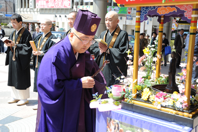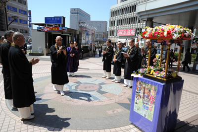 ながの東急様の正面玄関前にお釈迦さまの誕生仏をお移しする、遷座式を勤修いたしました。法要後は往来の方々にも自由に灌仏をしていただきました。